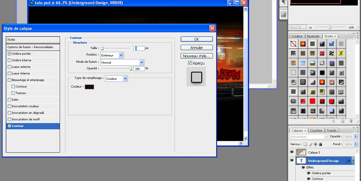 Puis passez le mode de fusion du calque en incrustation. Ensuite faite glisser le calque sous le calque de texture puis éditer les styles de calques et appliquer le style suivant : Ombre portée et contour.